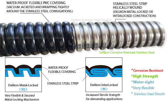 As the industry leader in flexible conduit system, Delikon offers one of the widest ranges of Stainless Steel series cable flexible conduit solutions available in the market today. With unmatched quality and service, we offer a variety of styles, materials and coating available to support virtually any commercial and industrial cable management application requirement.